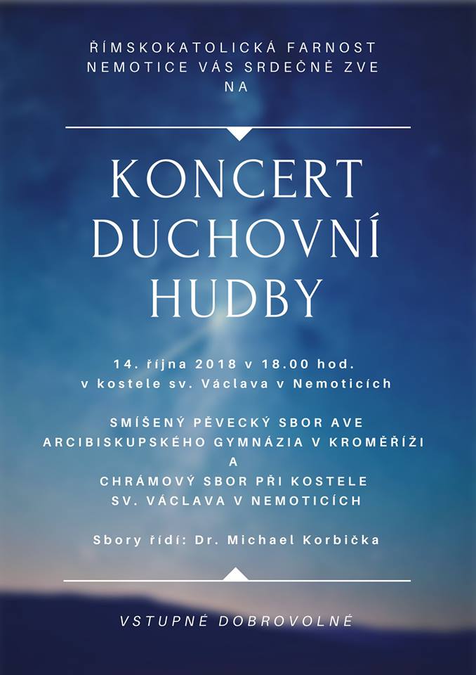 Římskokatolická farnost Nemotice vás zve na koncert duchovní hudby. V neděli 14.10. v 18 hodin v kostele sv. Václava v Nemoticích.