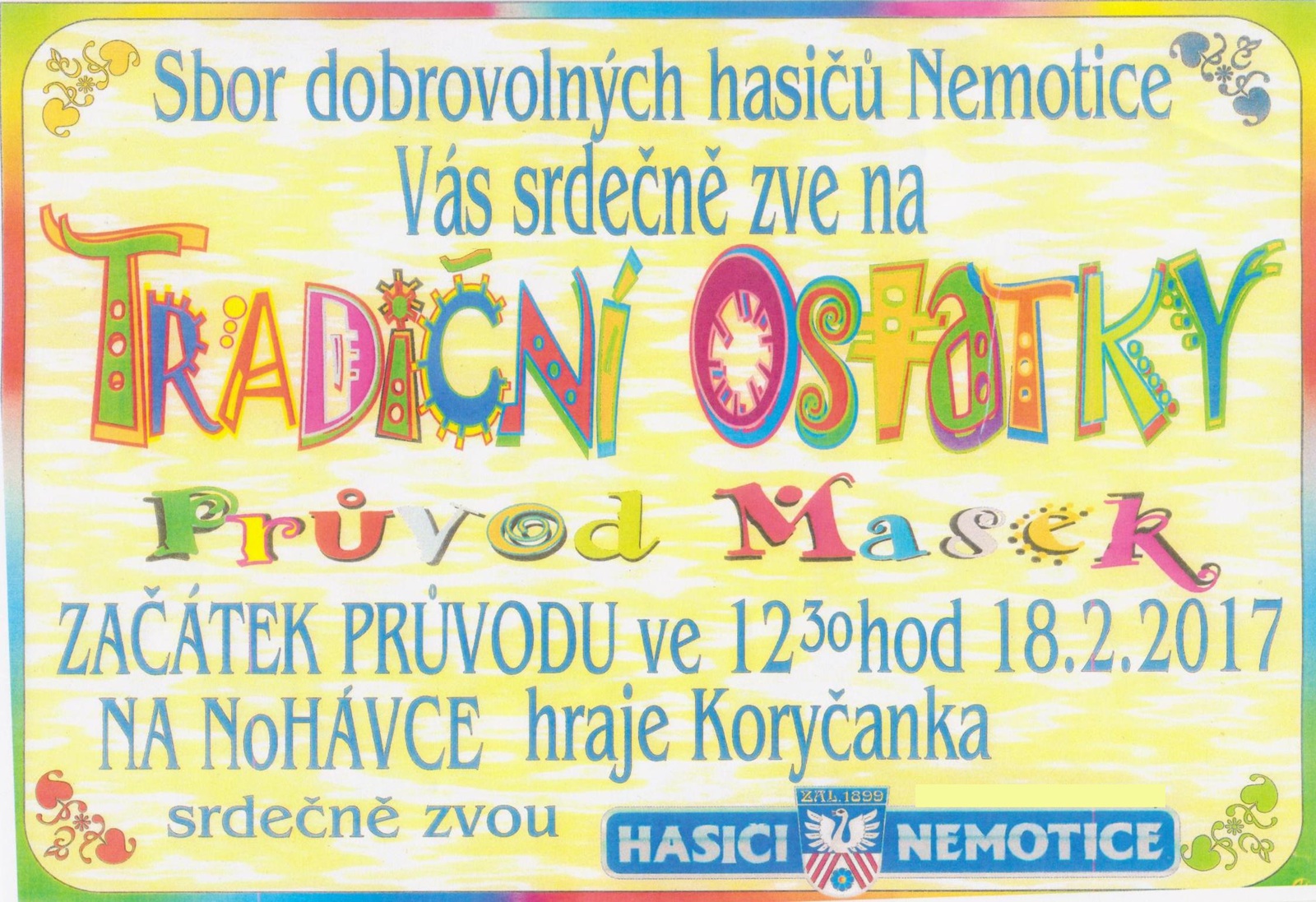 Sbor dobrovolných hasičů Nemotice Vás srdečně zve na ostatkový Průvod masek obcí. Začátek je v sobotu 18.2.2017 ve 12.30 hodin na Nohávce. Hraje Koryčanka.